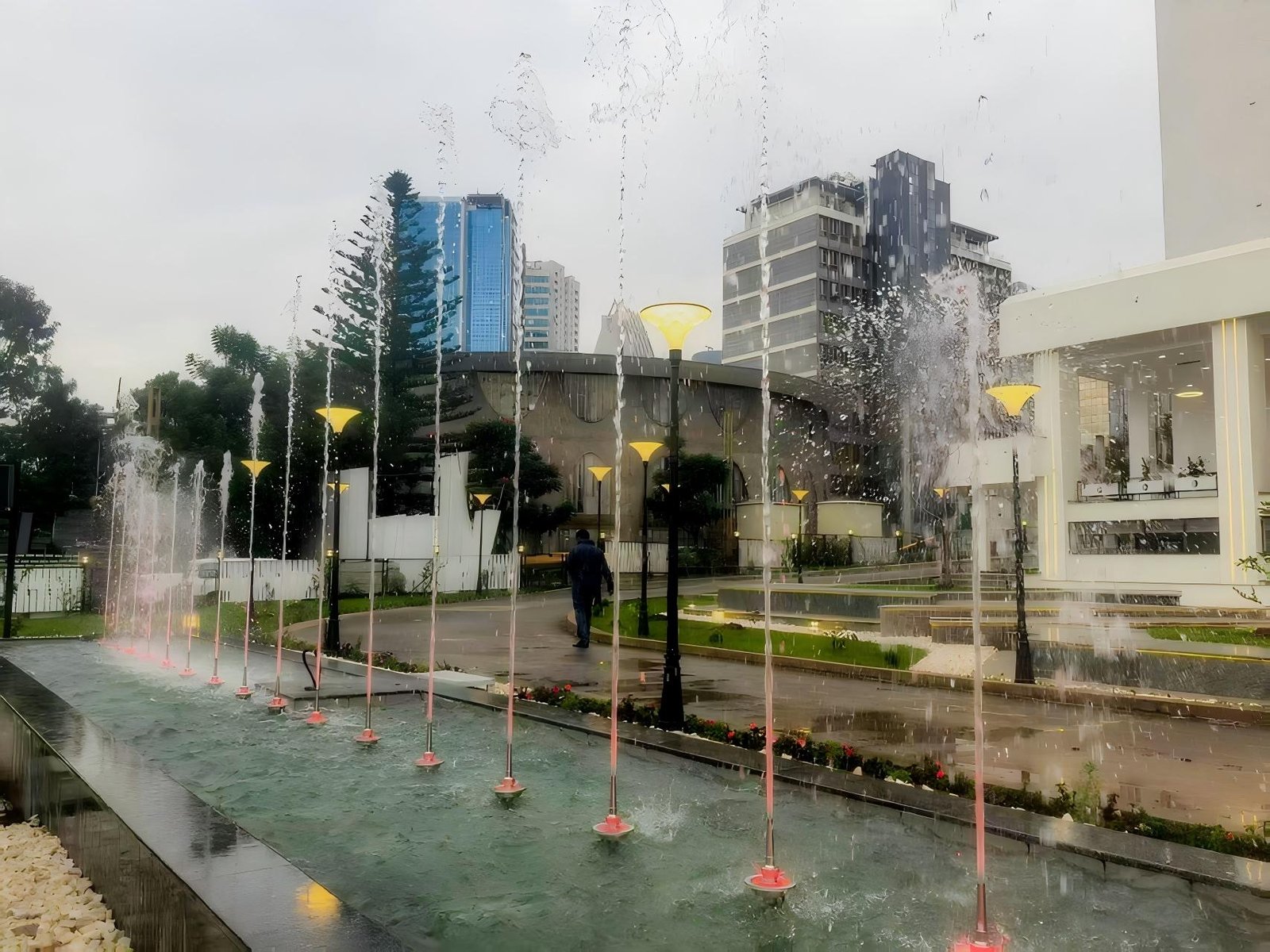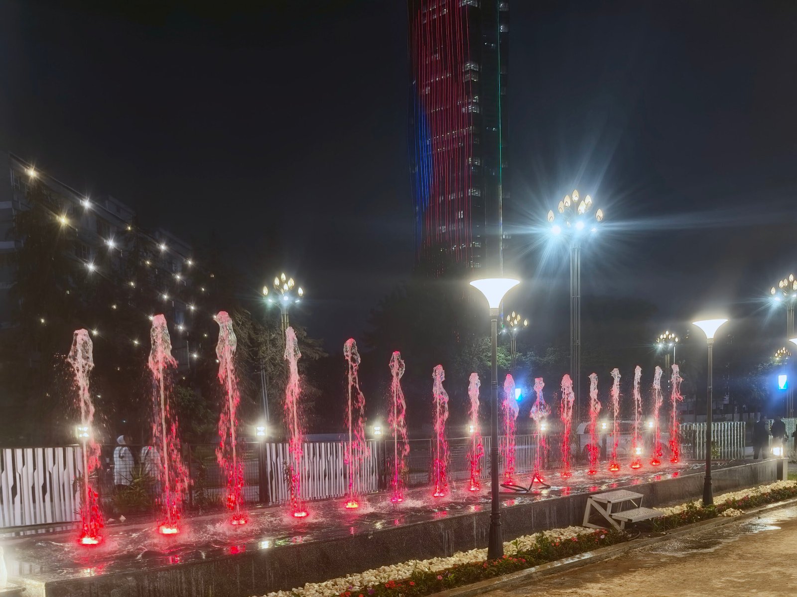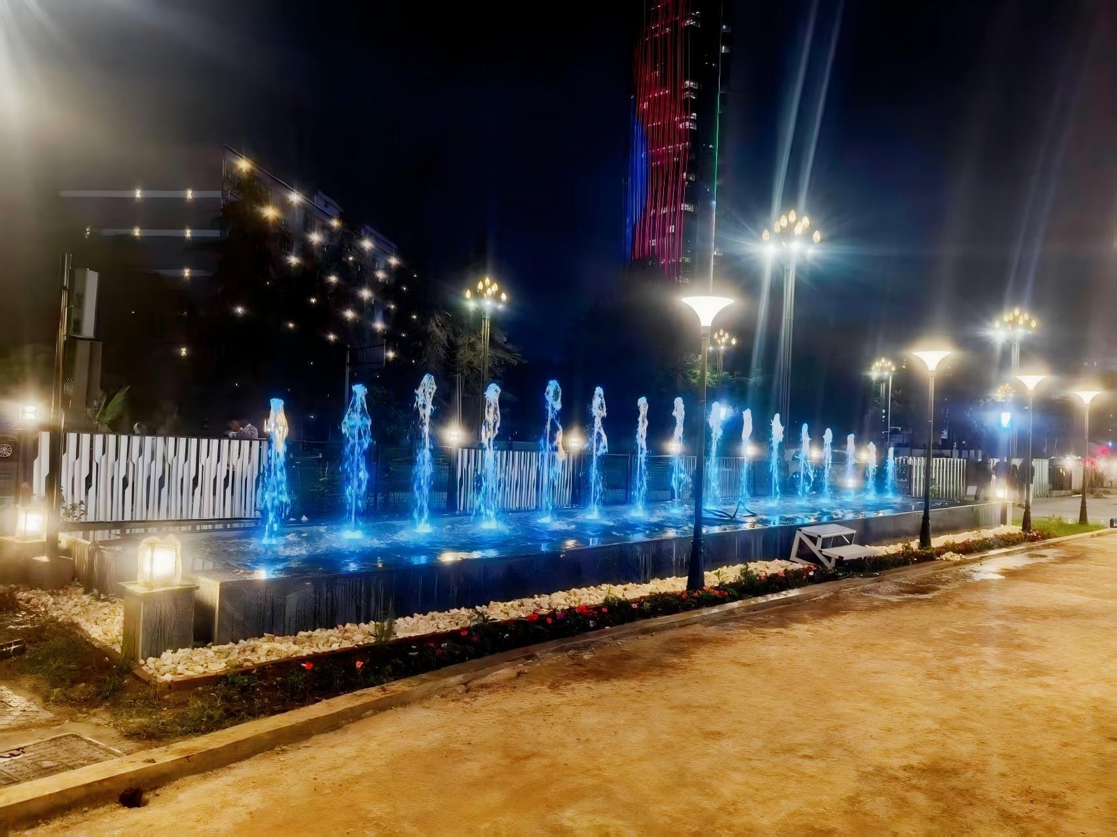 This music fountain project in Ethiopia, designed and installed by Changsha Himalaya Music Fountain, consists of two pools equipped with a total of 32 sets of VFD waving chasing fountain systems.