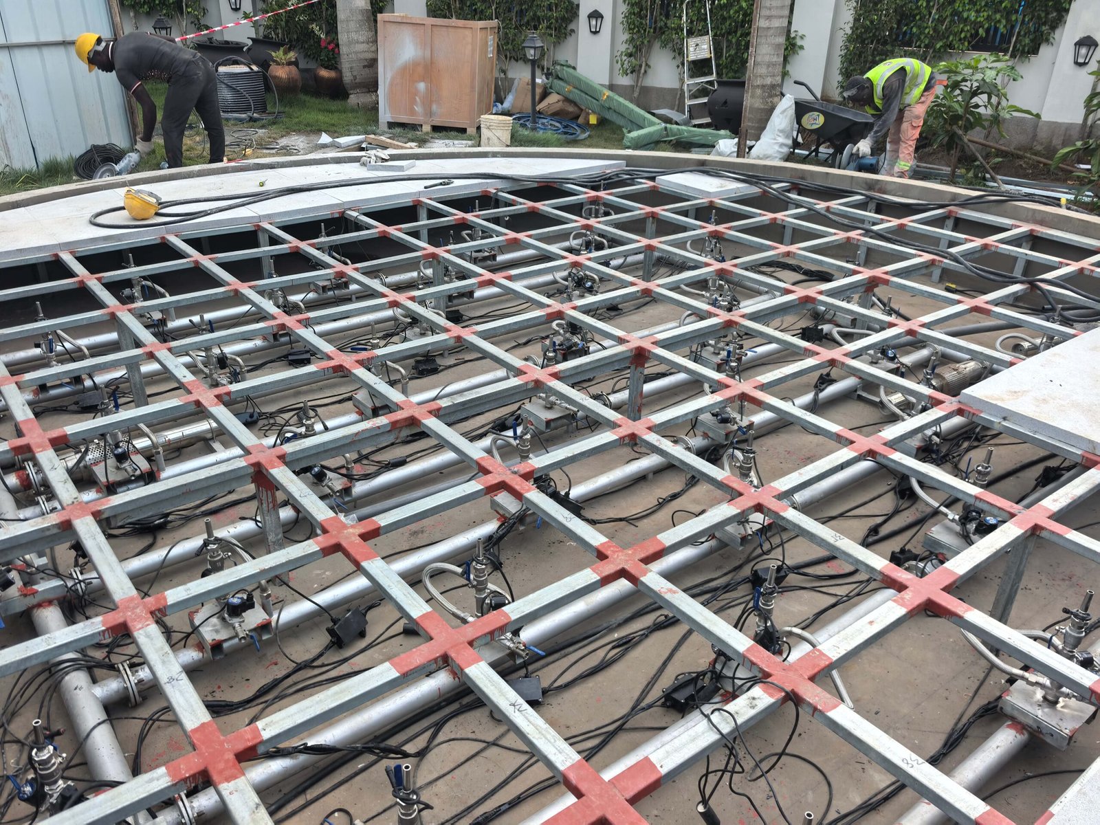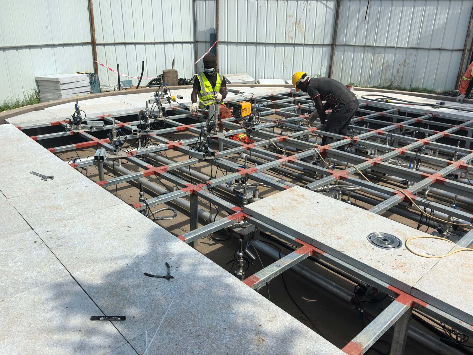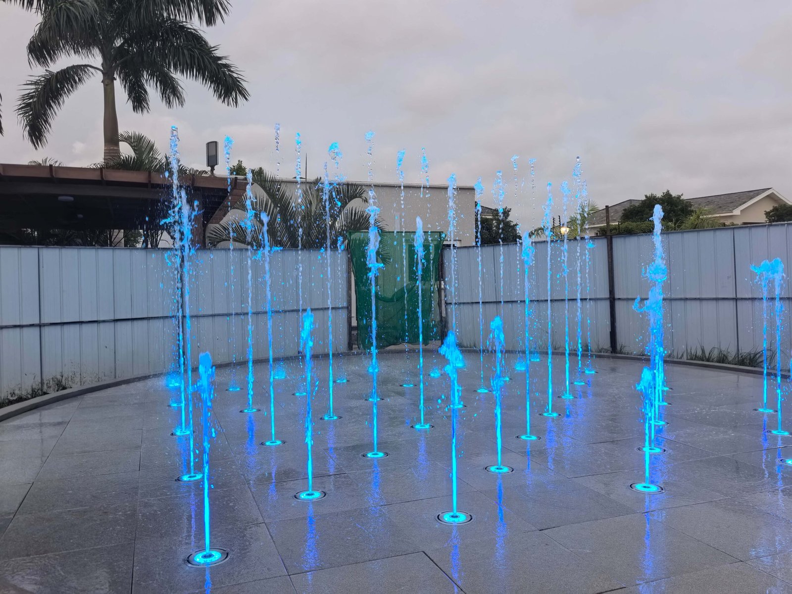 The Ghana Interactive Dry Fountain project for President Office, designed and manufactured by Changsha Himalaya Music Fountain , features a pool structure built with a steel framework and finished with marble cladding. All fountain equipment, steel structures, and marble components were independently designed and produced by the company.